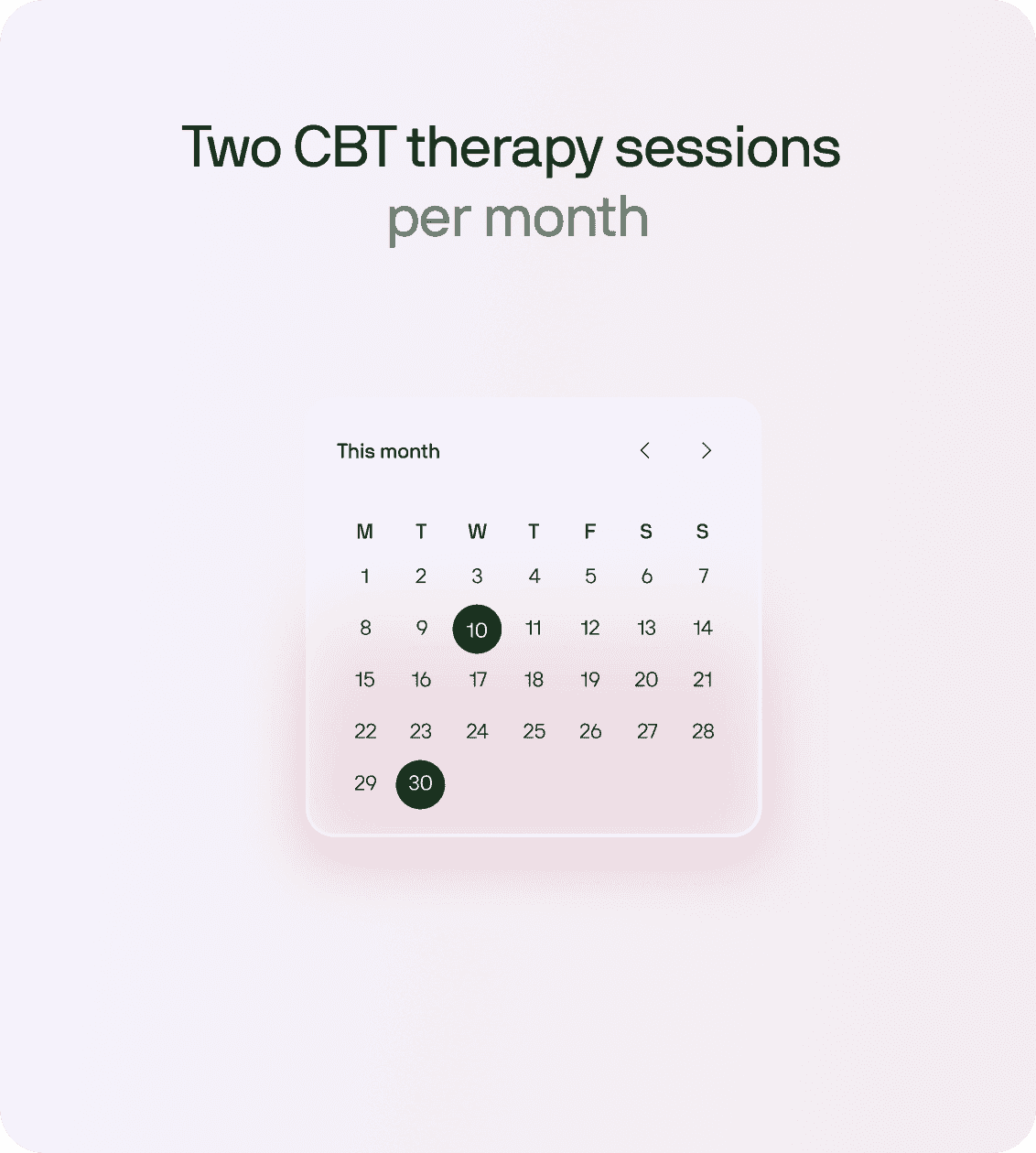 Your plan will include two CBT sessions per month with your therapist over the course of the 3 month plan. In your sessions, you will have the space to reflect, challenge patterns and build new ways forward.